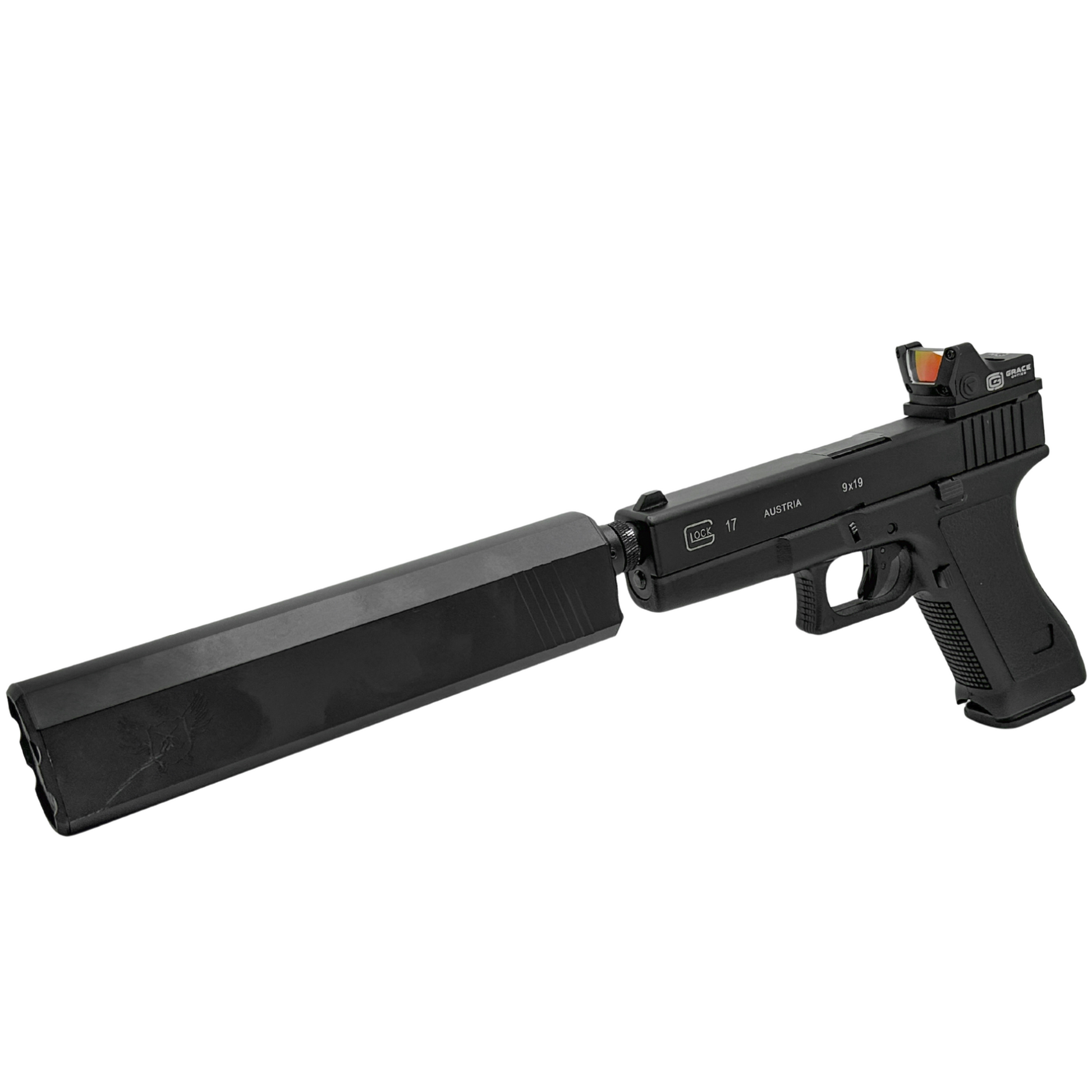 Welcome to the all new custom G17 "Silent Night" pistol by GBU. Built for power, accuracy and of course aggression this pistol boasts stealth from top to bottom.