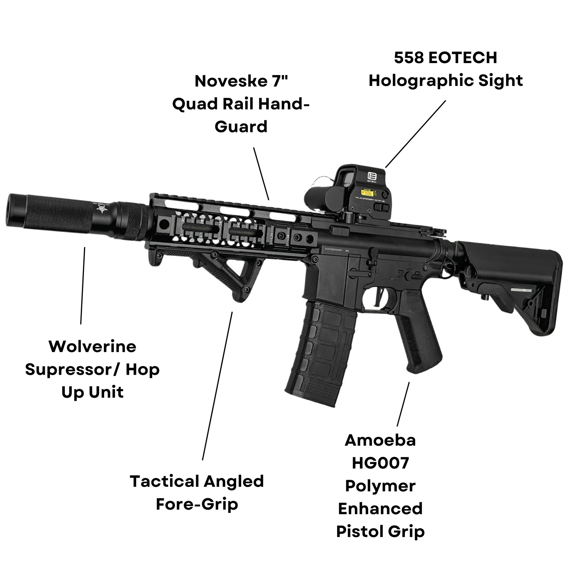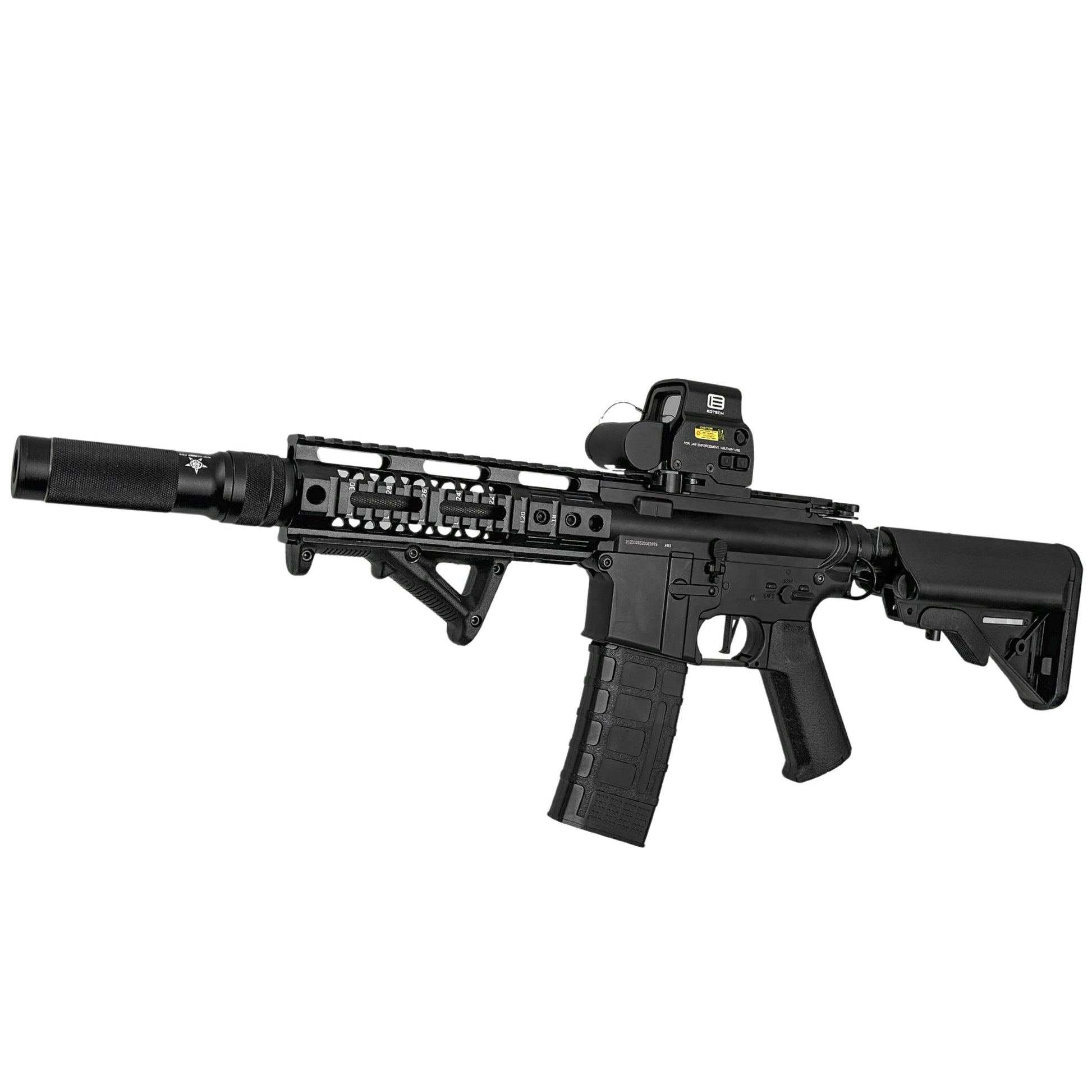 Fully competition ready and with a shooting power of 330+ feet per second this blaster is no joke, with the latest GBU Custom skeleton suppressor paired with the Noveske licensed 7" hand-guard makes this build second to none.