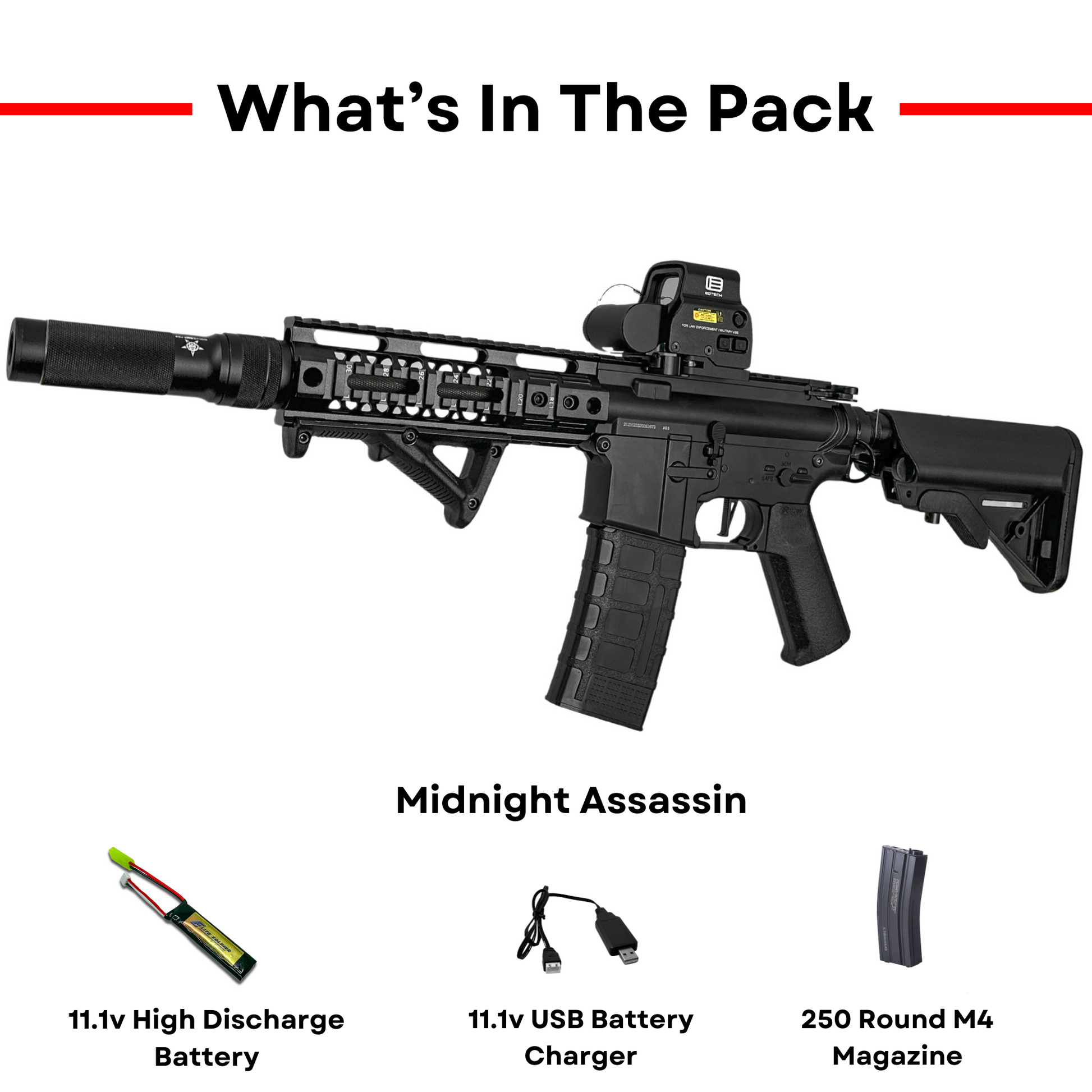 This is the "Midnight Assassin" custom MilSpec competition rifle. This custom build is definitely one of a kind. With a full metal inside and out construction paired with a very aggressive looking aesthetic makes this blaster one of the highest performing gel blasters in the industry to say the least!